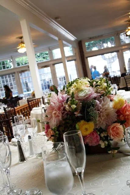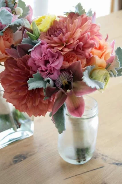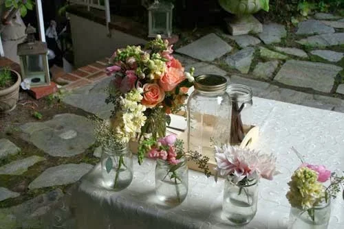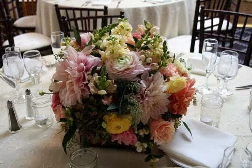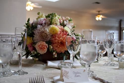 Reception table centerpieces were also in the garden style. Dahlias, snapdragons, roses, stock, ranunculus, hydrangea, snowberries, and seeded eucalyptus were held in brown wooden boxes. Tea lights in 1/2 pint jelly jars surrounded each centerpiece.