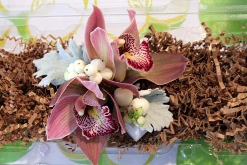 The mothers wore wristlets of burgundy/brown cymbidium orchids with dusty miller and snowberries.