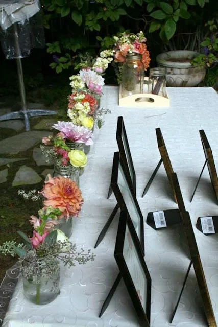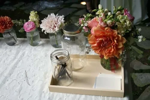 For the escort card and guestbook table, we placed a medium arrangement of garden flowers in a 1 pint mason jar. The edge of the table was lined with smaller mason jars holding stems of garden flowers – dahlias, stock, snapdragons, seeded eucalyptus, roses, and ranunculus.