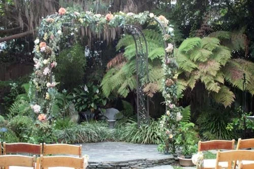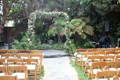 Lisa and Raul were married at the lovely venue, Occasions, in downtown El Segundo. The ceremony was held in the garden and the bride and groom stood beneath a wrought iron canopy. We decorated the canopy with ivy vine, roses, dahlia, seeded eucalyptus, and hydrangea. The colors were subtle – pale pinks, peach, gold, ivory, and greenery – so it all blended and fit well with the rest of the garden.