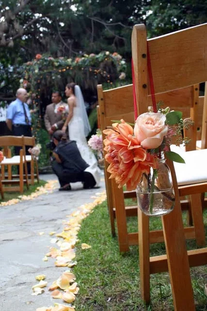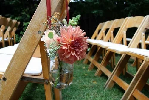 Mason jars of dahlia, roses, stock, and snapdragons hung from the aisle chairs.