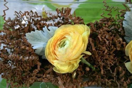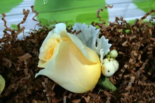 The groom wore a matching boutonniere featuring a pale yellow rose accented with dusty miller and snowberries. Groomsmen and family members wore ranunculus boutonnieres accented with dusty miller.