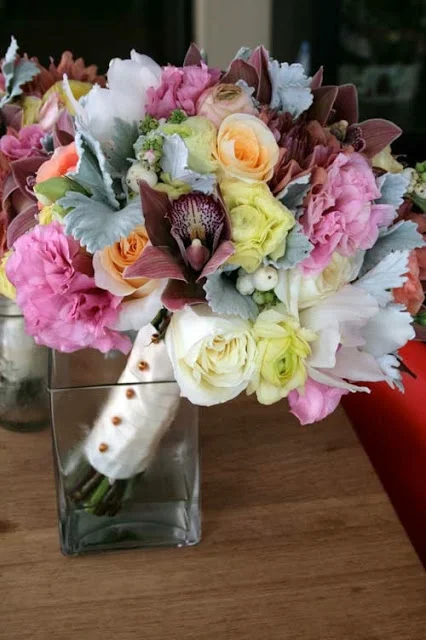 The bride carried a gorgeous bouquet in the garden style with dark brown/burgundy cymbidium orchids, pale yellow ranunculus, pink lisianthus, ivory roses, pale pink cymbidium orchids, pink ranunculus, peach roses, golden orange dahlia, and white snowberries.