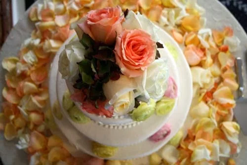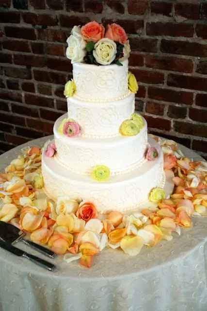 We placed a cake topper of flowers on the top tier of the wedding cake and decorated each tier with small cluster of flowers. The bottom tier was surrounded by ivory, peach, and light orange rose petals. I loved how the flowers looked against the exposed brick wall!