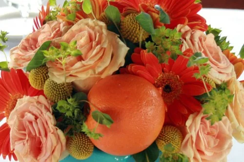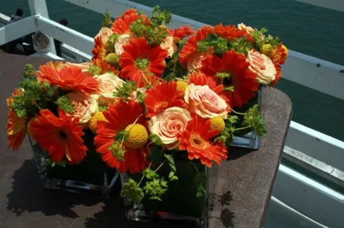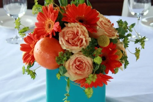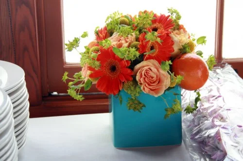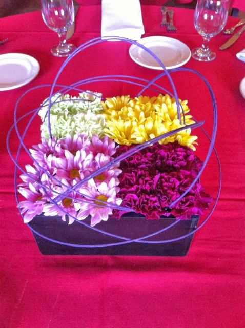 Half the tables held a terrarium-inspired arrangement and the other half held a geometry-inspired centerpiece. We made these geometric centerpieces using a square wood box. The design featured four different colored flowers, each making up a quadrant. We then accented the arrangement with loops of purple flexible reeds.