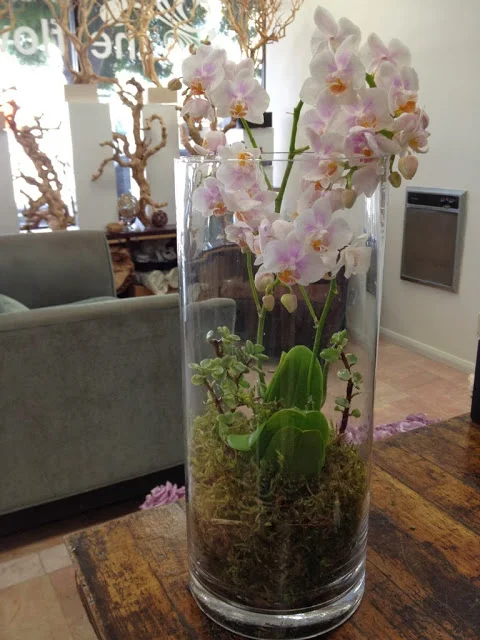 Into clear glass cylinders, we placed a phalaenopsis orchid plant along with moss and a few stems of a jade plant. A simple centerpiece using plant material we have all seen before, but when placed within a glass container, it looks new and different. Maybe something right out of a plant lab! And to top it off, they are easy for the students to take home and maintain themselves.
