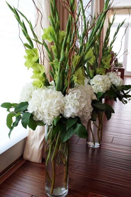 Tall arrangements for the church altar were comprised of velvety green gladiolas and white fluffy hydrangea.