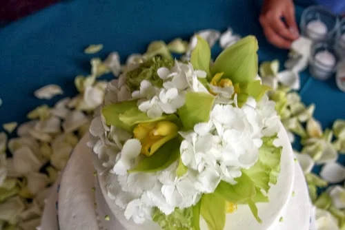 Tiffany (my assistant extraordinaire) took most of these pictures. I really like the composition of this picture of the wedding cake topper – so creative! The flowers we used include hydrangea, cymbidiums, and roses.