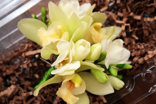 Corsages for the moms featured light green mini cymbidium orchids as well as white freesia.