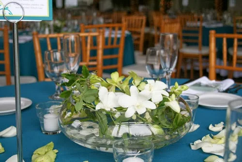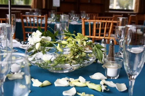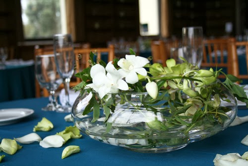 I really like how the floating centerpieces turned out – not your typical arrangement with a few floating orchids in a lily bowl. The lily bowl has been around