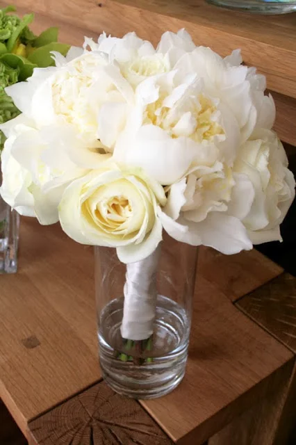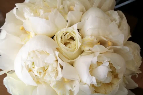 I love the flowers in Jennifer’s bouquet: white peonies, “polo” roses, and white cymbidium orchids with sweet little yellow marks in the lips. My new favorite ivory rose to use are “polo” roses because they open beautifully and look like vintage garden roses.