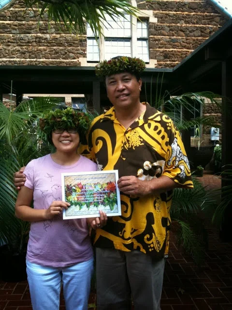 Last month hubby and I went to the lovely garden isle of Kauai to attend our friends’ Dallas and Rachelle’s wedding. On our second day there, I saw an article in the local paper about a lei making workshop at the Kauai Museum. It was not your typical needle lei-making class, but rather a 6 hour long affair to learn the wrapping or “wili” method of making a head lei or lei po’o. You know it’s going to be intense when they tell you to bring your own sack lunch!