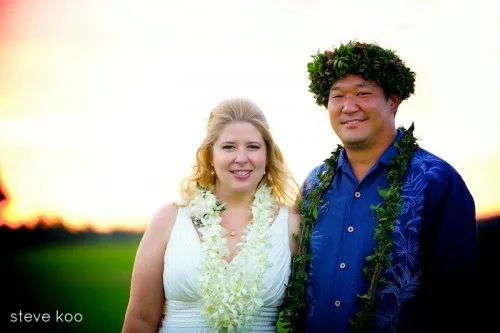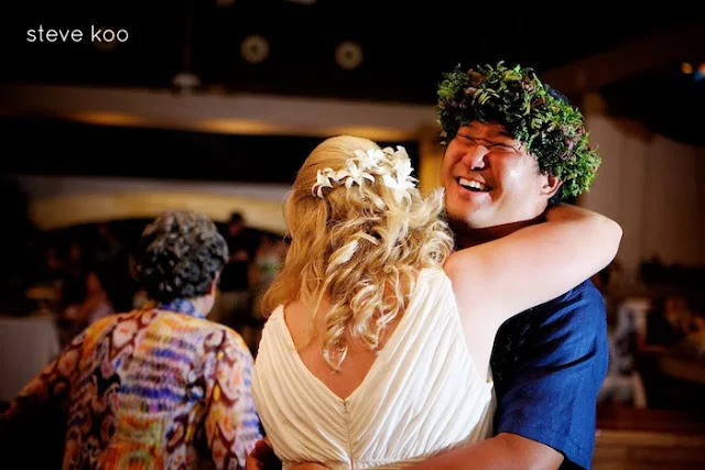 After class, I asked Kumu Kalei if it would be appropriate to wear the lei I just made to Dallas and Rachelle’s wedding. He replied that it was very much appropriate indeed. In fact, giving the gift of lei is very special and is a gift of the heart. I considered giving the lei to the bride and groom, but I only had one to give and suspected they probably had their own leis specially prepared for the wedding. So I wore the head lei to the wedding (to poor hubby’s embarrassment!) which was a lot of fun. After the ceremony, I gave it to Dallas and he wore it for their after wedding pictures and almost the entire rest of the evening. He got a little too sweaty with it on after he started to boogie.