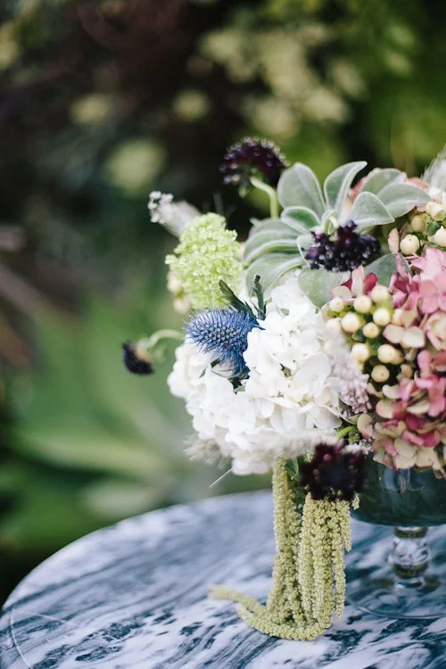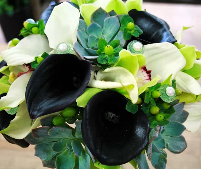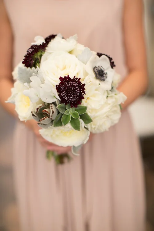 Sometimes our brides are more hands-on and crafty and decide to make their own centerpieces but hire us to provide the personal flowers. Here are some bouquets and boutonnieres we made for a recent wedding featuring succulents and dark “Schwarzwalder” mini calla lilies. We also inserted vintage buttons, which belonged to the bride’s grandmother, and incorporated them into the bridal bouquet.