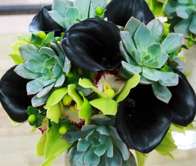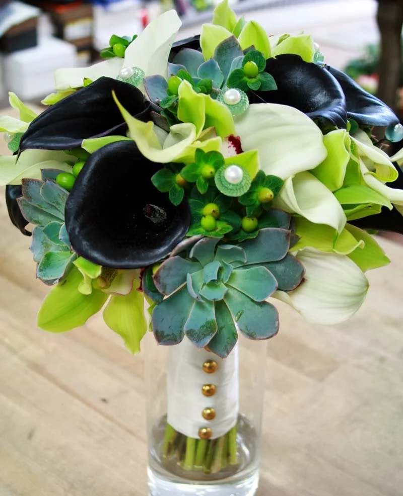 The bridesmaids bouquets were slightly darker without any white mini calla lilies and were made of succulents, dark “Schwarzwalder” mini calla lilies, green hypericum berries, and green cymbidium orchids.
