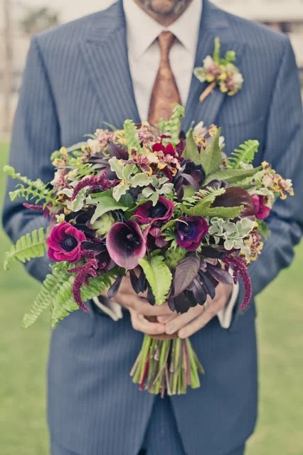 At the market that week, I saw that my favorite phalaenopsis orchid supplier had buckets of these awesome bicolor yellow and burgundy orchids. I let these orchids set the tone for the rest of the bouquet and included deep burgundy mini calla lilies, burgundy anemones, dark brown/burgundy succulents, and burgundy amaranthus. In addition to the flowers, sword ferns, variegated Italian pittosporum, and large branchy leaves filled out the bouquet.