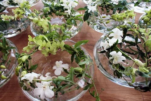 , but here they look fresh and re-invented! I attribute it to the use of lush, leafy passion vines wrapped around the edge, some parts placed inside the bowl, and other parts above and outside of the bowl. Stems of white and green dendrobium orchids are not rigidly placed in the bowl, but rather allowed to breathe and angle over and around the lip of the bowl. Everything is kept tidy and within the glass bowl, but also looking loose and modern. So simple, yet looks elegant and new!