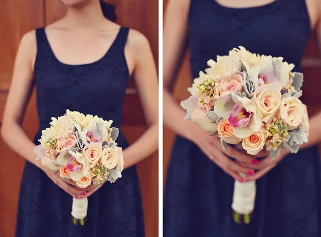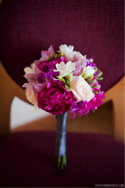 The maid of honor carried a similar bouquet but with magenta peonies, magenta dendrobium orchids, pink cymbidium orchids, white freesia, and white “polo” roses.
