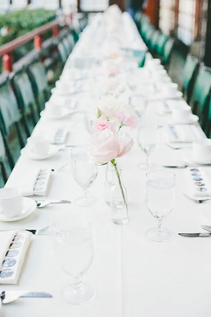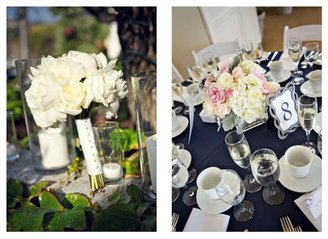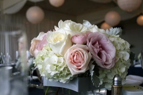 Stephanie and Dave’s colors were pink, ivory, navy, and silver. With flowers, it was easy to bring in the pink and ivory using roses, peonies, ranunculus, hydrangea, and cymbidium orchids. For silver, we used touches of dusty miller (so beautiful!) and wrapped the centerpiece glass containers with a band of silver ribbon. The tables were covered with a lovely navy linen.