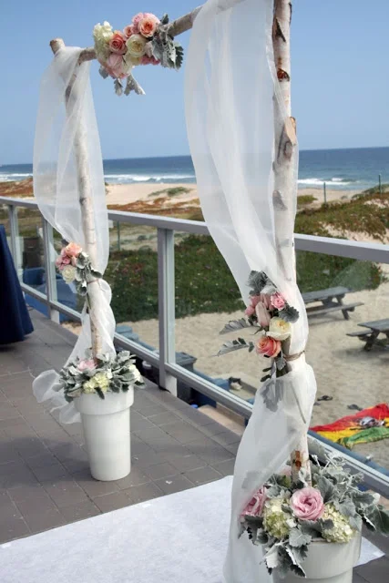 I love the arch we used for the ceremony. Stephanie wanted something simple and natural, made out of branches. Here we used three thin birch logs and secured them in white pots. Some simple, gauzy, organza draping blew gracefully in the breeze. And we finished off the look by attaching flowers to the top and sides: pink roses, white hydrangea, and dusty miller leaves.