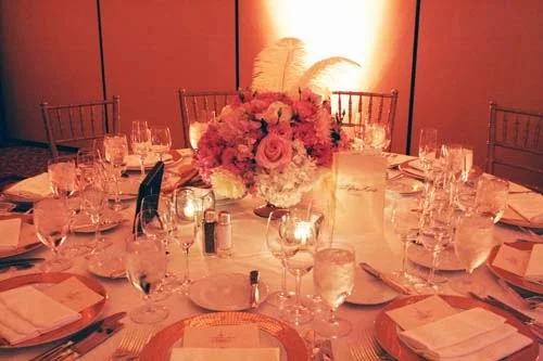 To help cut down on costs, the tall reception centerpieces served double duty and were featured as the wedding ceremony flowers. The flowers were the same, but we made them look slightly different, arranging some of the feathers at the bottom of the arrangement and some at the top. Also, to slightly “disguise” them, we placed the flowers on gold aisle posts arranged in an arc surrounding the bridal party.