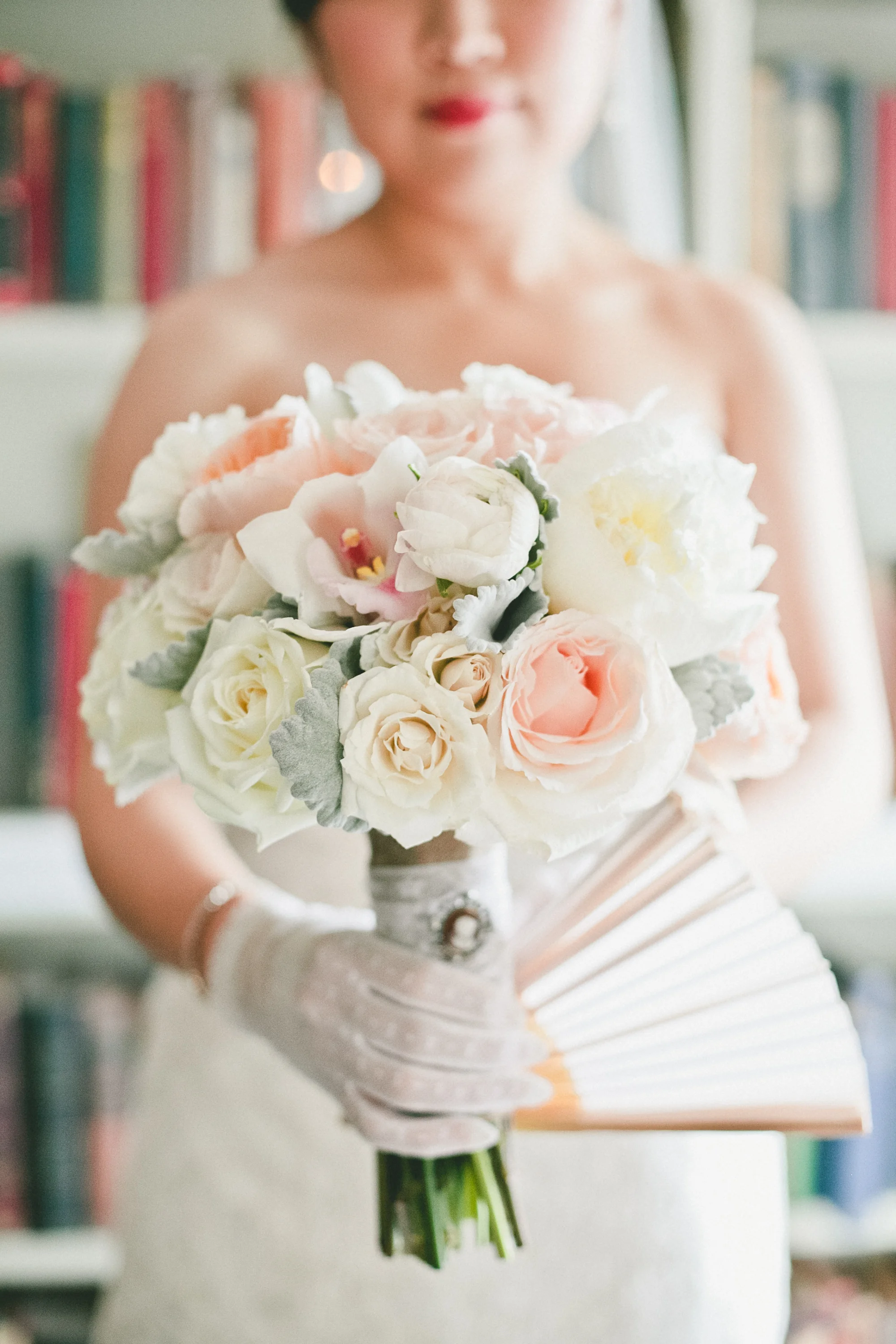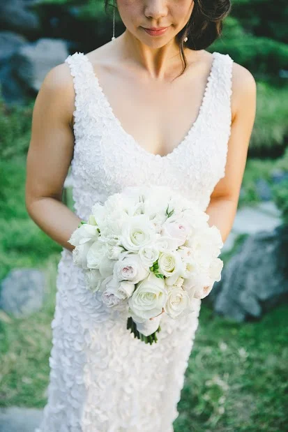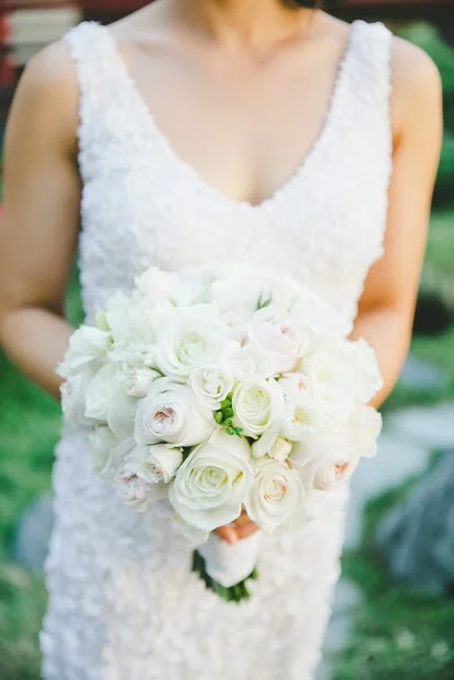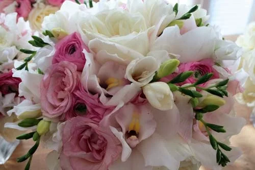 Nicole carried a bouquet of white and blush pink flowers: white peonies, blush pink peonies, white “polo” roses, white freesia, and white cymbidium orchids with magenta throats.