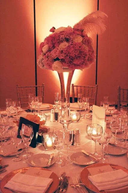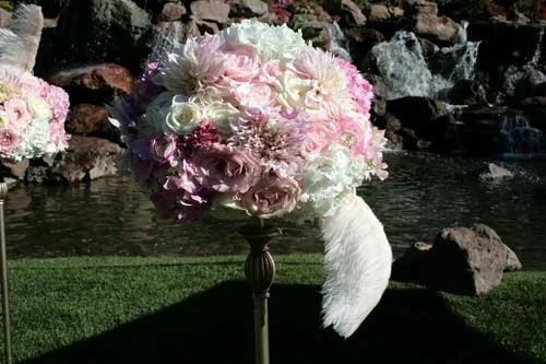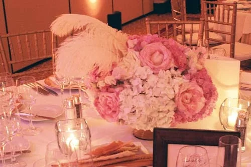 For the reception table centerpieces, we had half low and half tall arrangements with the same flowers. The low arrangements were held in gold, glass footed bowls and the tall arrangements in 21″ curvy, footed clear glass vases. The flowers included: roses in ivory and pale pink, ivory and pink hydrangea, ranunculus, sweetpeas, dahlias, and lisianthus. The ivory plumes of ostrich feathers arranged at an angle completed the look!