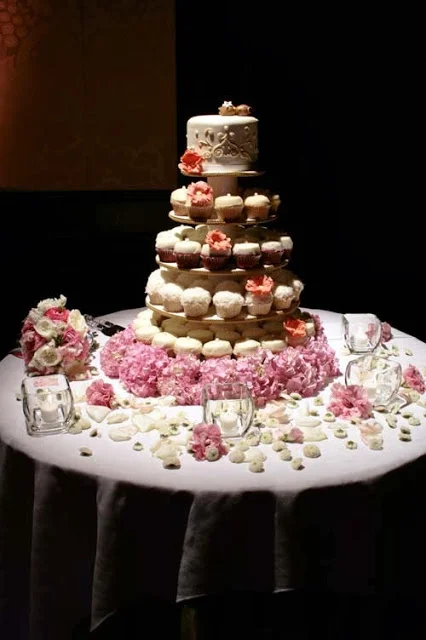 We decorated the lovely cupcake wedding cake tier with a ring of pink hydrangea at the bottom of the cupcake tier. The toss bouquet and loose blossoms were arranged around the table.