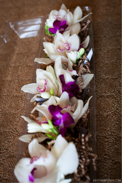 The ring bearer carried a pillow made of white cushion poms and decorated with pink cymbidium orchids and magenta dendrobium orchids.