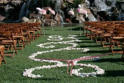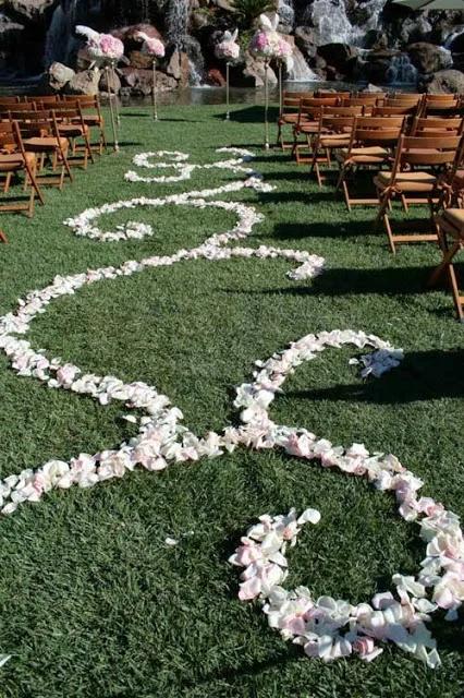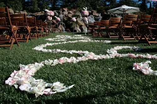 We arranged the pale pink and ivory petals into swirls and curls down the length of the aisle. Lucky for us, there was hardly any wind that day! I have always loved the look of petals making a pattern down the aisle! Surprisingly, it isn’t as difficult as it looks, but does require more petals than usual and getting down on hands and knees in the soft fluffy grass.
