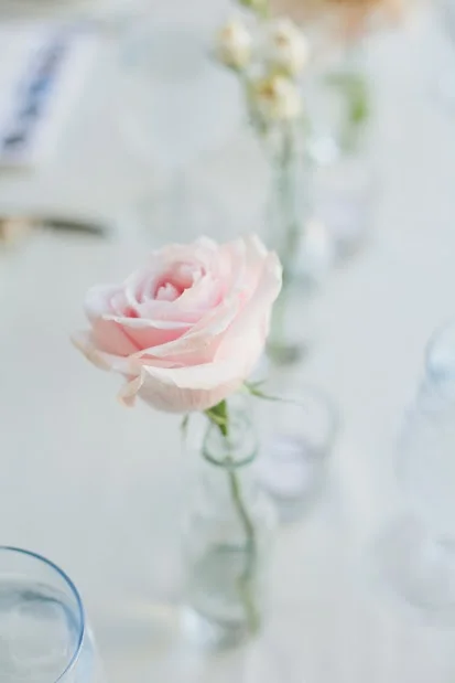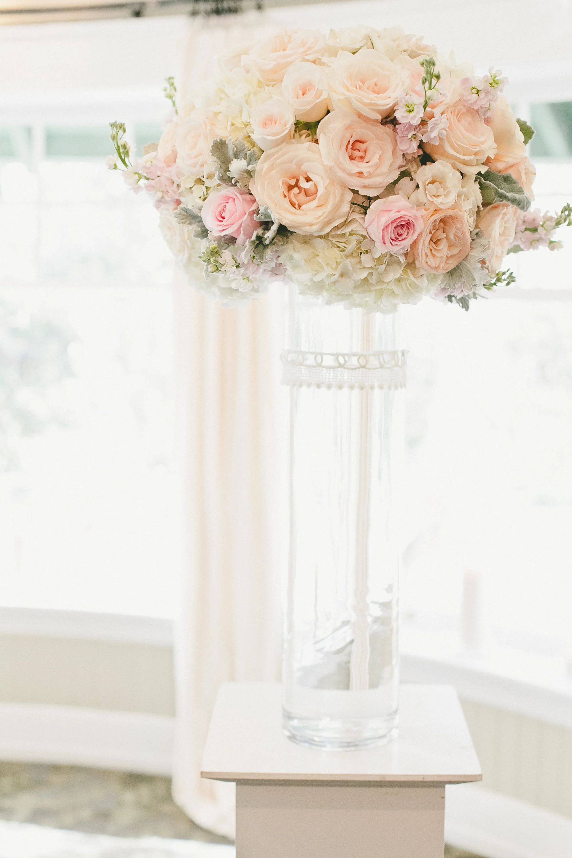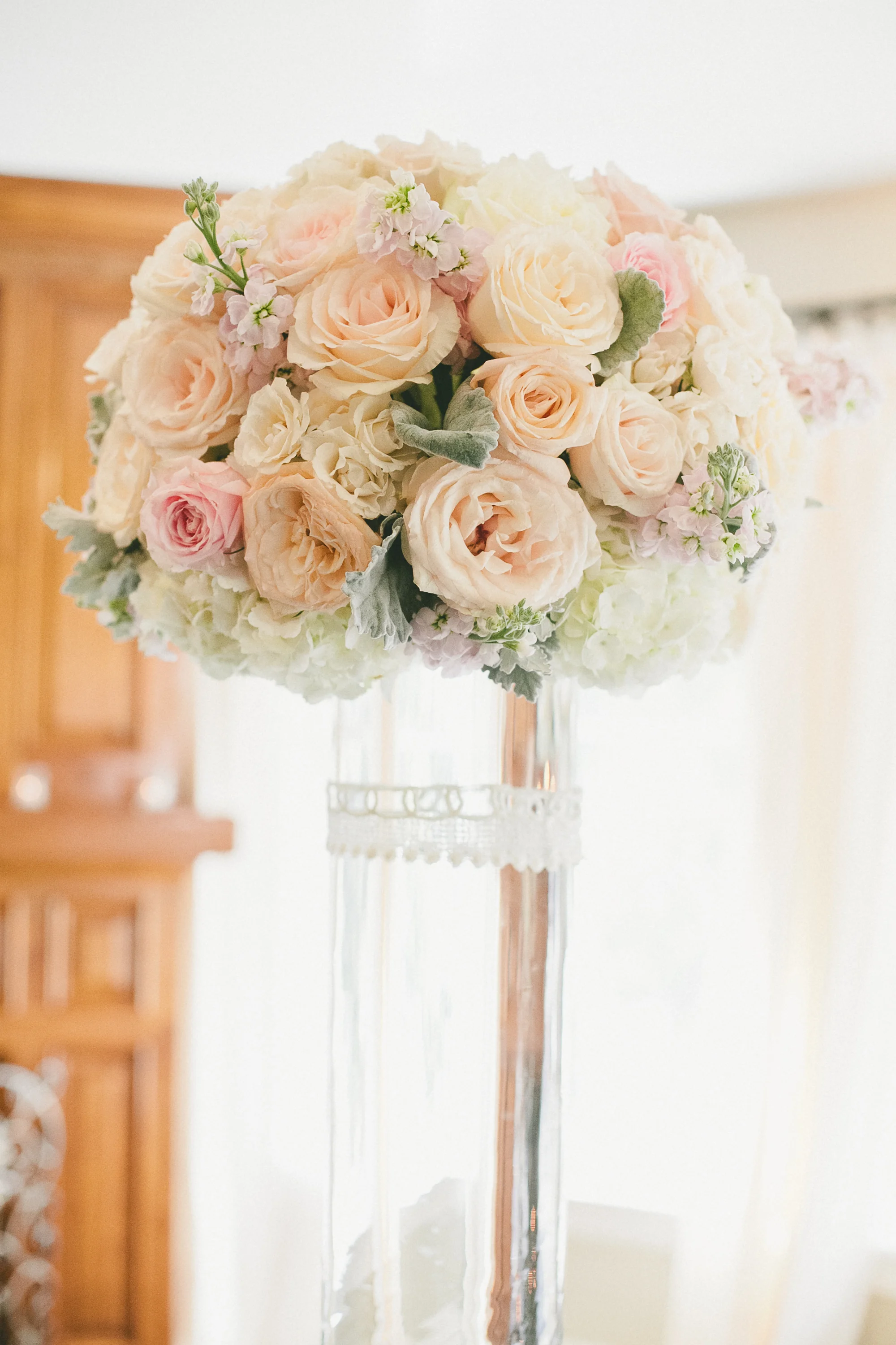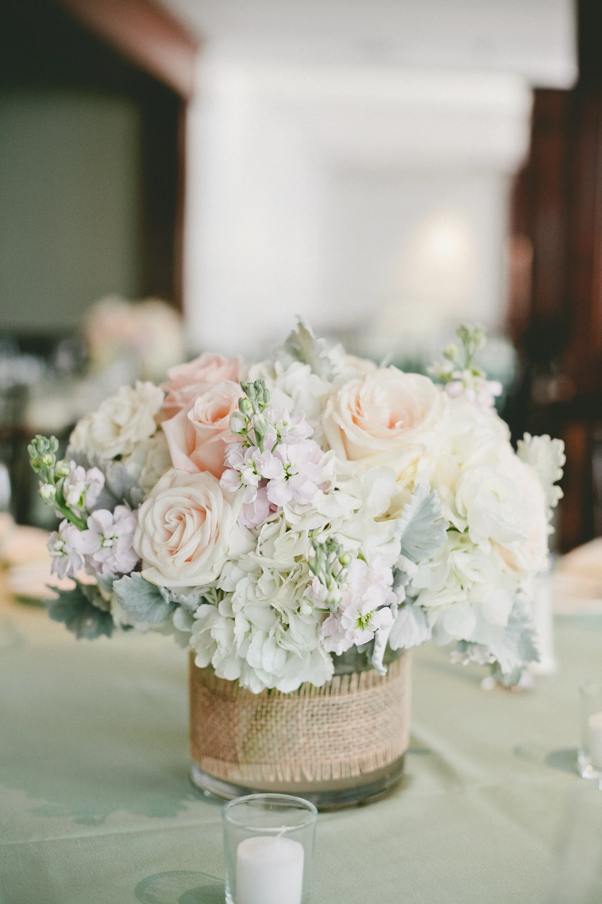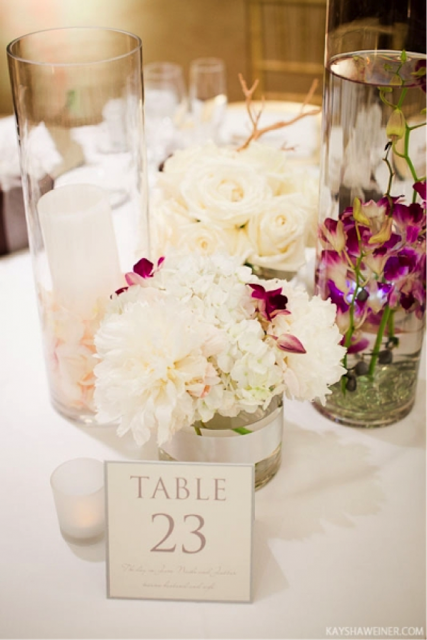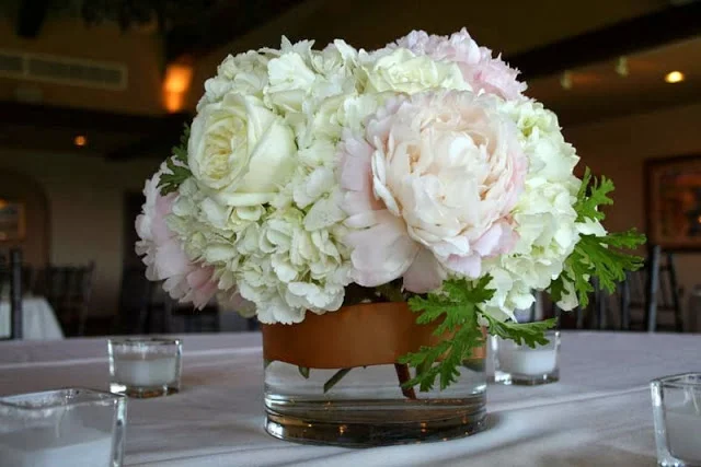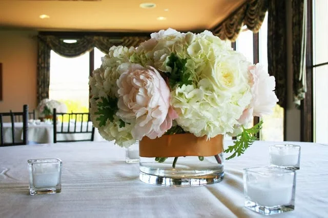 Each reception table held a low centerpiece of ivory hydrangea and ‘polo’ roses and blush pink peonies. We wrapped the clear glass cylinders with a band of gold ribbon.