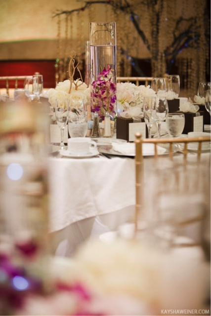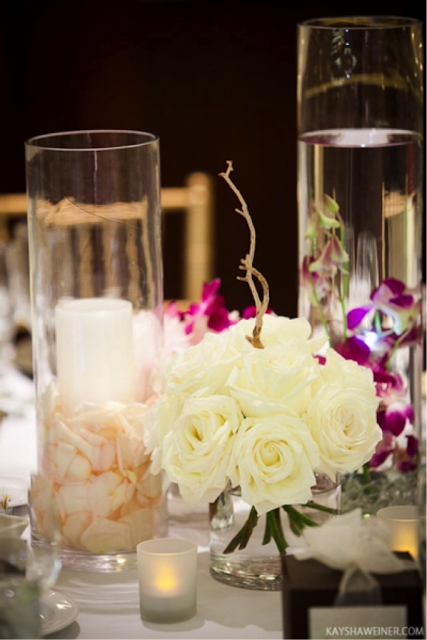 Nicole was clever and wanted to use the reception table flowers as ceremony decor as well. The aisle was lined with clear glass cylinders holding magenta dendrobium orchids immersed in water as well as clear glass cylinders holding a pillar candle on a bed of blush pink rose petals. Both cylinder designs were later moved to the reception tables.