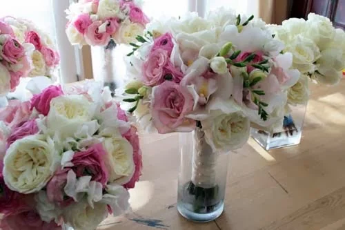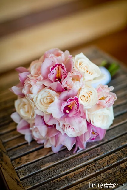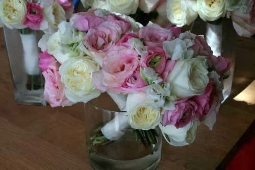 Stephanie’s bouquet was all white and ivory with “Polo” roses, cymbidium orchids, and lovely ivory peonies. Her bridesmaids carried bouquets of all pink flowers – peonies and roses