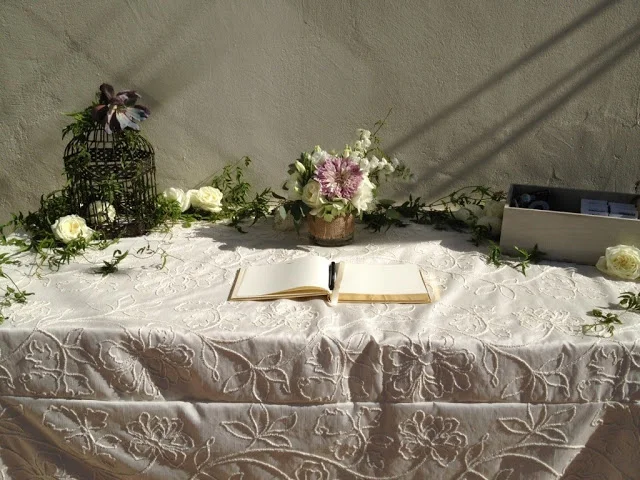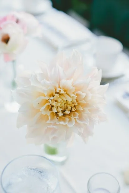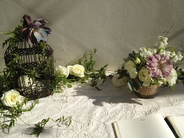 The guestbook table held a small arrangement of dahlias, roses, hydrangea, and delphinium. The table and birdcage were also decorated with jasmine vines and some loose rose and dahlia blossoms.