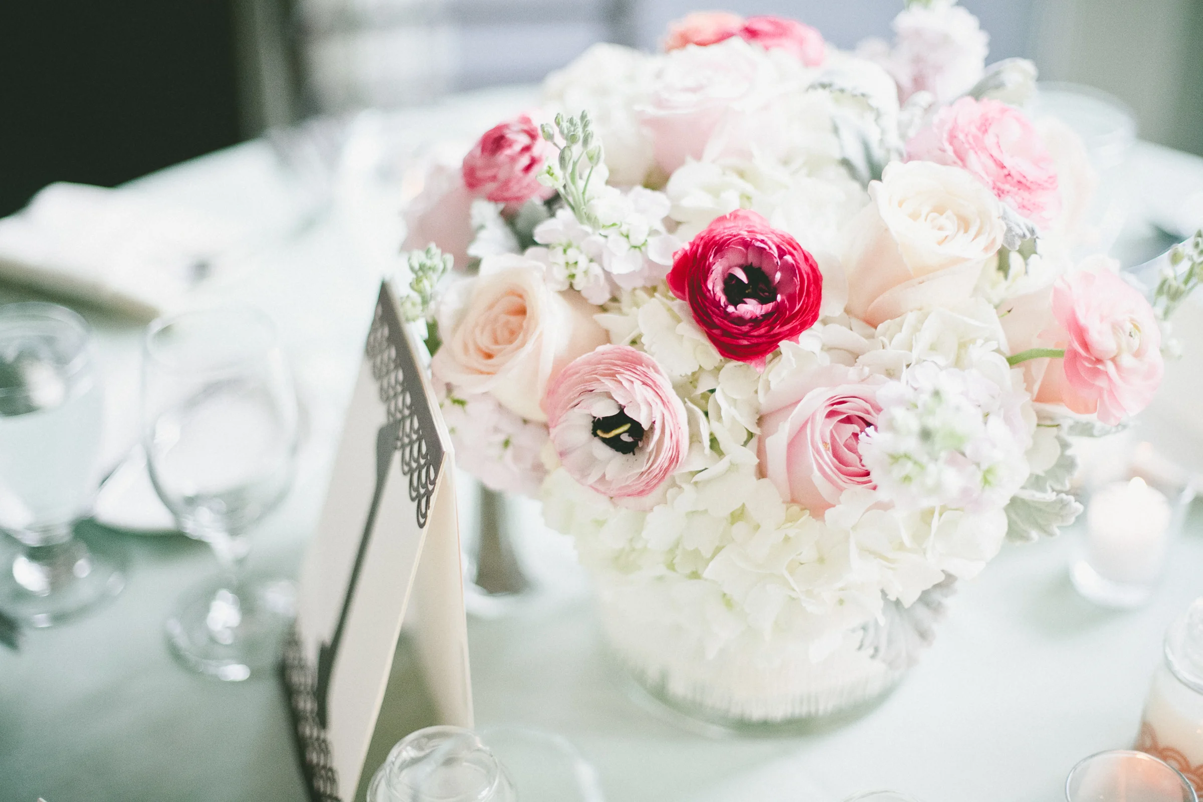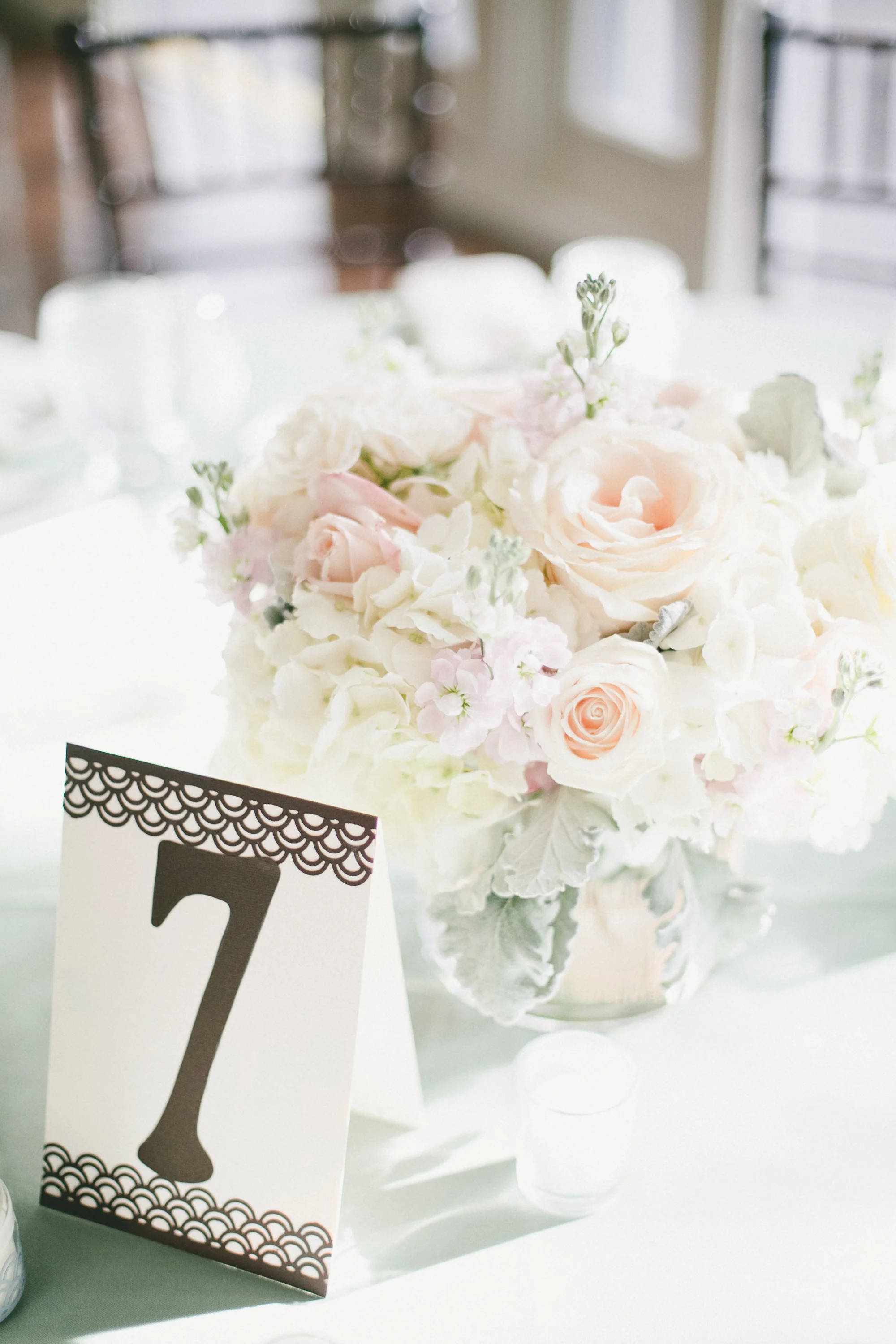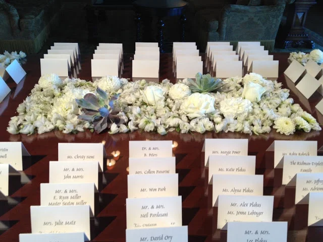 A tall arrangement of all white hydrangeas accented the place card table.