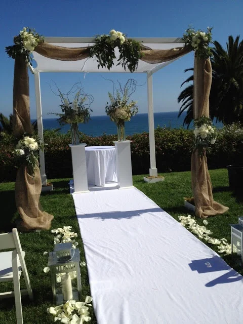For Alexa and Evan’s wedding, the theme was natural and rustic, yet refined. After all, it was an evening wedding at a private beach club. The ceremony was held outdoors, and the chuppah was decorated with burlap draping accented with bouquets of white roses, dahlias, and lisianthus, and succulents and seeded eucalyptus. Under the chuppah were two pedestals each holding a tall, natural arrangement with curly willow branches, antique green hydrangea, queen anne’s lace, and tall stems of white delphinium. We lined the aisle with white rose petals as well as lanterns with pillar candles.