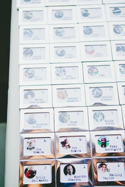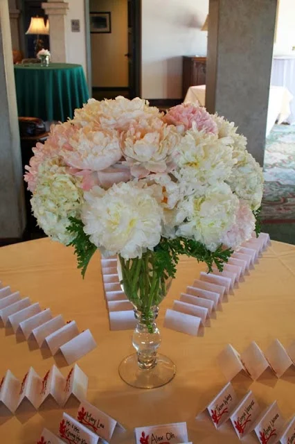 We placed a tall arrangement of hydrangea and peonies in the center of the escort card table with the escort cards radiating out from the flowers.