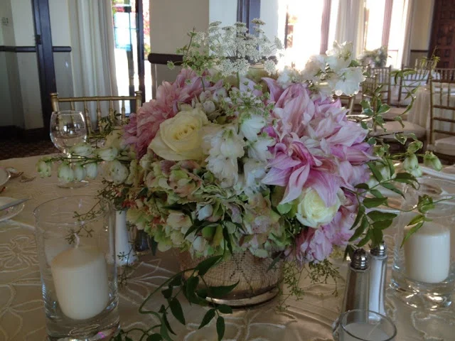 We had a lot of fun making the centerpieces. 6″ glass cylinders were wrapped with a burlap ribbon and filled with a variety of flowers for a natural, rustic look. The flowers included: antique green hydrangea, “cafe au lait” dahlia, white delphinium, “polo” roses, queen anne’s lace, seeded eucalyptus, festival bush, Italian pittosporum, and jasmine vine. Interestingly, all but the hydrangea and roses were local California grown flowers!