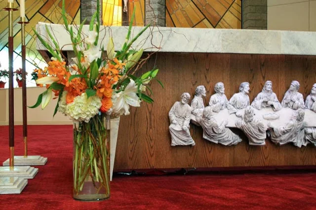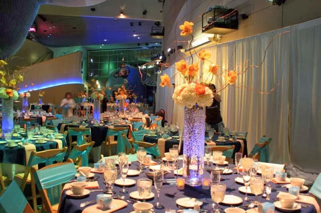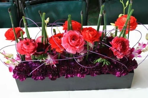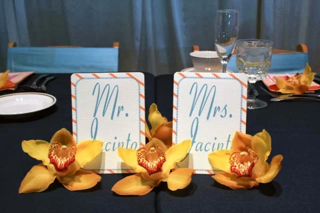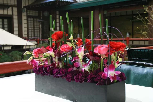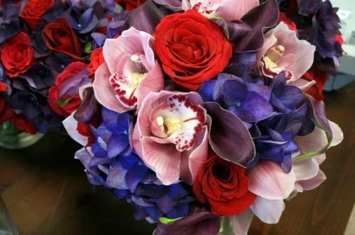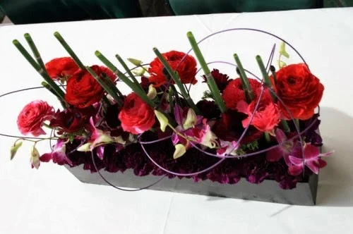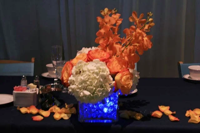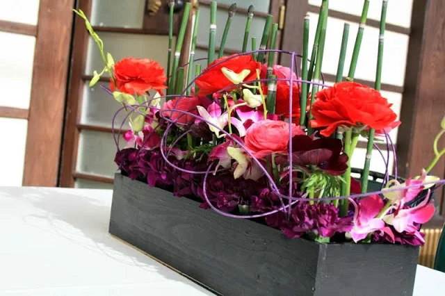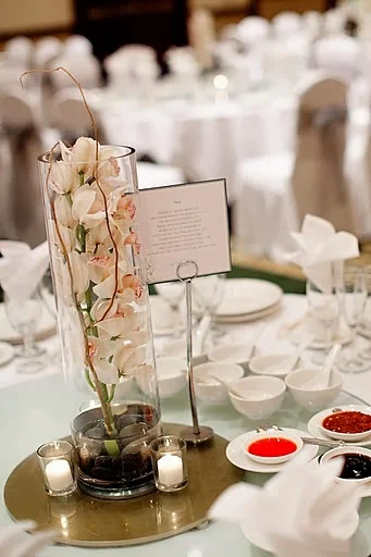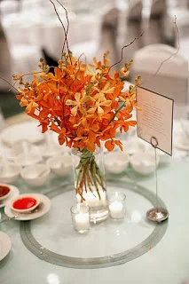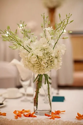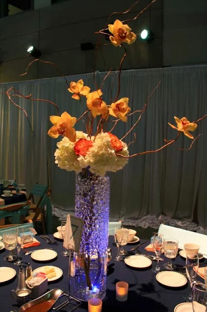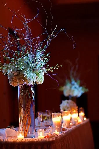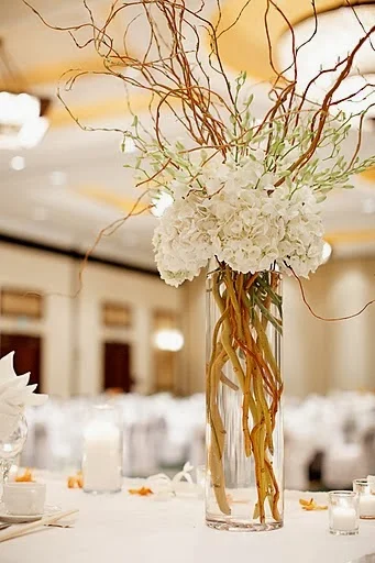 We made a tall arrangement with curly willow, white hydrangeas, white dendrobium orchids for the escort table.