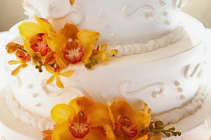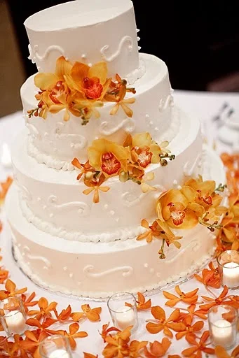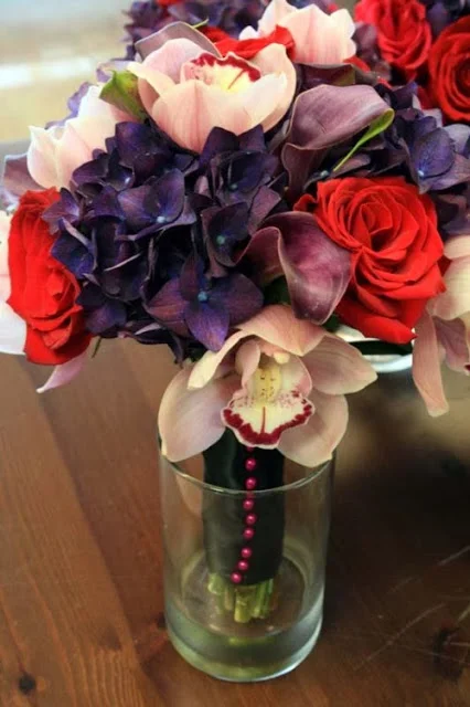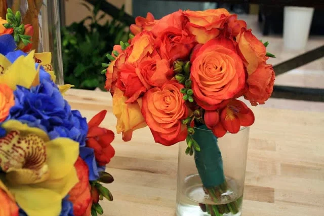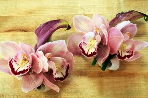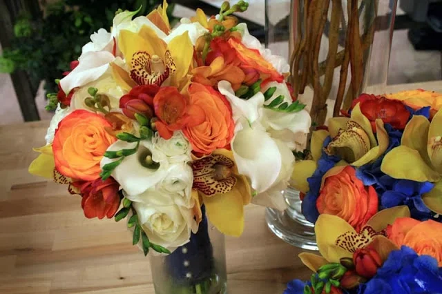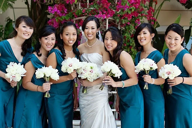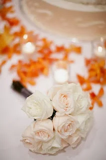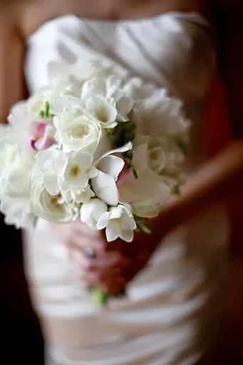 Maria carried a bouquet of white and ivory flowers: white “polo” roses, white freesia, and white cymbidium orchids with pink throats, white mini calla lilies.