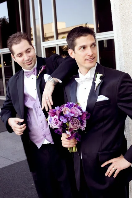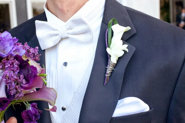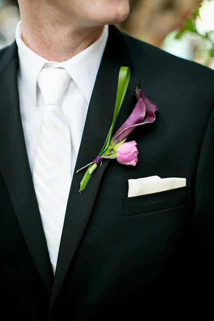 Hide wore a pink cymbidium orchid boutonniere accented with horsetail, while the groomsmen and family members wore purple mini calla lily boutonnieres, also accented with horsetail.