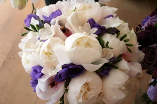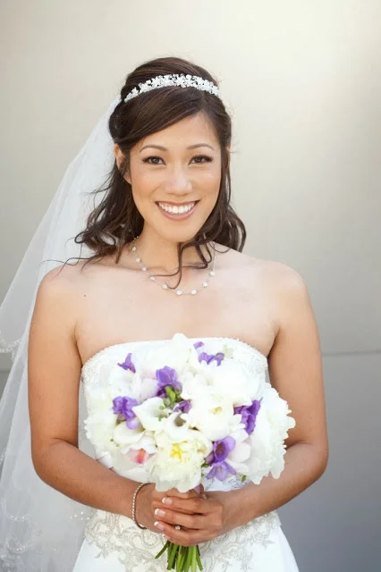Kaori carried a bridal bouquet of mostly white flowers accented with lavender: white peonies, white “polo” roses, white ranunculus, lavender freesia, lavender herbs, lavender hyacinth.