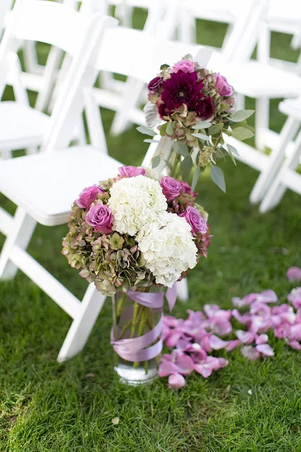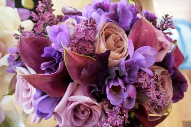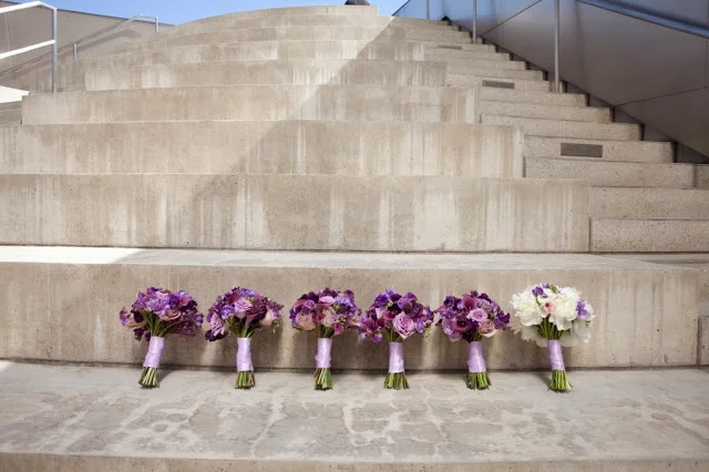 Angeles carried a bouquet of purple hydrangea, pink lisianthus, purple freesia, “polo” roses, and cafe au lait dahlia. The bridesmaids bouquets featured purple lisianthus, cool water roses, and pink cymbidium orchids.