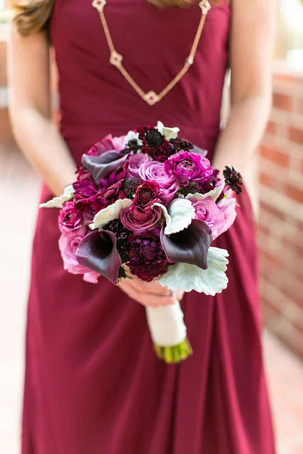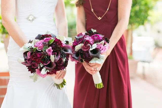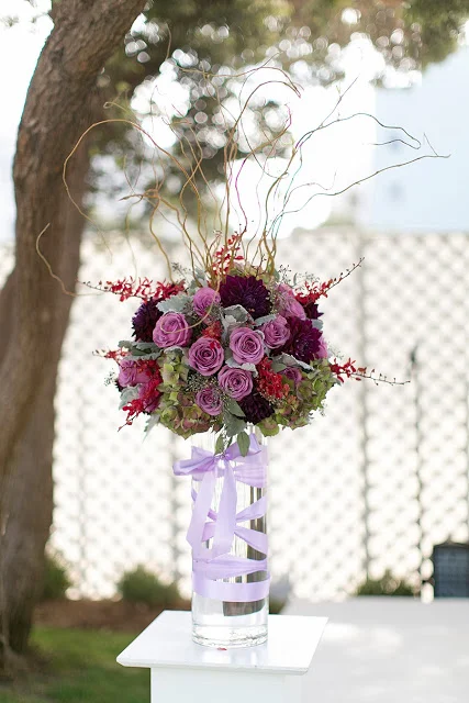 It was a colorful wedding in red, purple, and pink at Yamashiro Restaurant in Hollywood. Corinna carried a hand-tied bouquet of purple hydrangea, pink cymbidium orchids, purple mini calla lilies, and deep red roses.