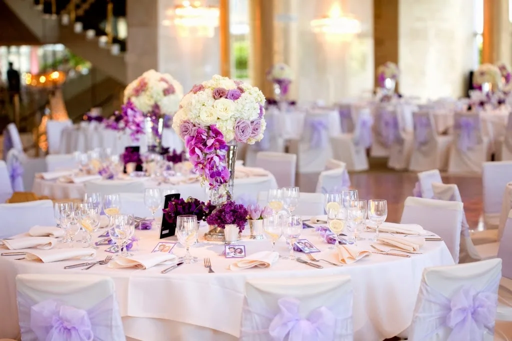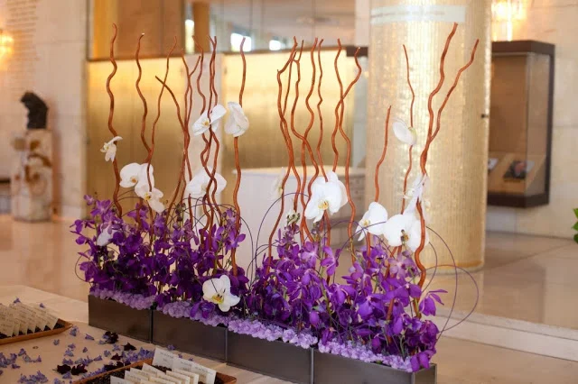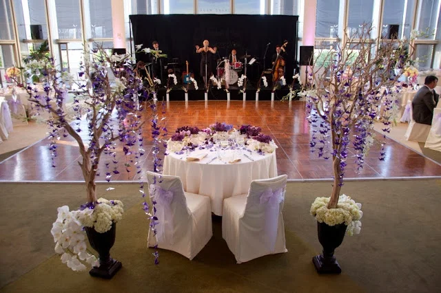 The centerpieces were comprised of a grouping of three rectangular vases each with a layer of sand and white cymbidium orchids. The cymbidium orchids had purple on the lips – perfect for the purple and lavender themed wedding
