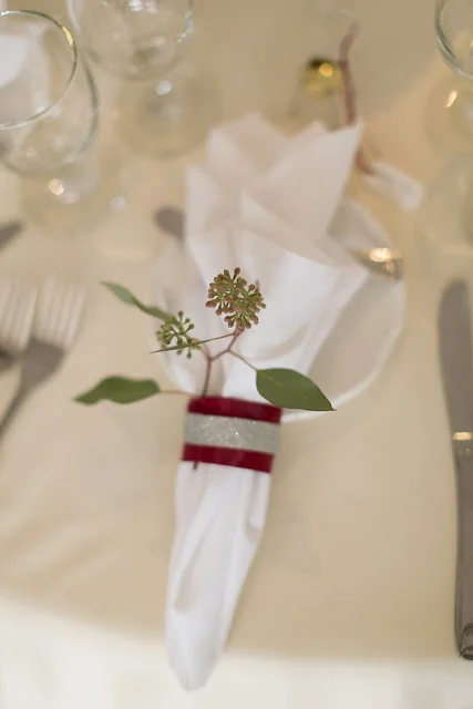 For the centerpieces, Corinna and Hide requested bright and vivid colored flowers arranged in a unique and modern design. Each table sat six guests and we placed a rectangular centerpiece in the center. We topped the surface of each black wooden box with purple or plum carnations and arranged a row of short pieces of horsetail down the mid-line of the box. Then we arranged, in parallel, red and fuchsia ranunculus, plum anemones, and magenta dendrobium orchids around the horsetail. As a finishing touch, we weaved several lengths of purple midollino around and throughout the flowers and horsetail. These unique and colorful centerpieces were a big hit!