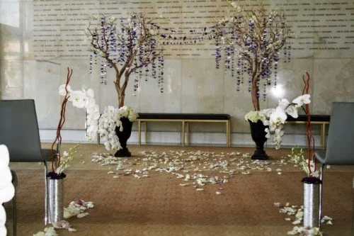 The ceremony was held outdoors with a view of the water and downtown Long Beach. We decorated the chuppah with ivy, hydrangea, lisianthus, roses, and delphinium.