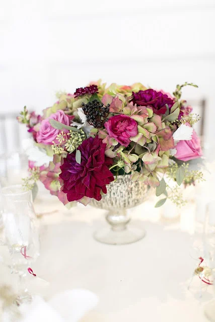 The other centerpiece design was a grouping of four glass bubble bowls of two different sizes. Each of these held an interesting flower or botanical, such as a king protea, a Fuji mum, several stems of green molucella, and purple hydrangea. Wispy stems of umbrella ferns completed the look – either arranged so the ferns stick out of the bowl, or are viewed through the walls of the glass bowls, like specimens in a terrarium.