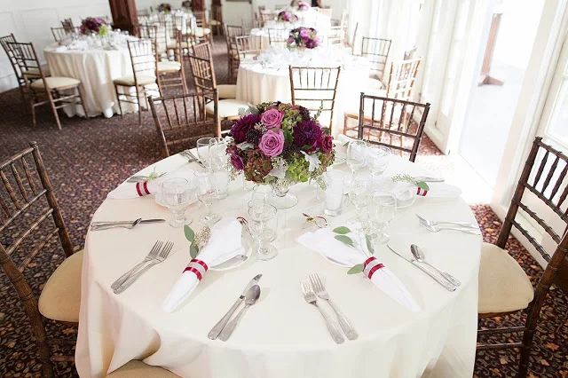 We had a lot of fun with the centerpieces! There were two designs which we placed on the 17 tables. One used a low, dark slate, square container that we filled with deep purple hydrangea, all sorts of interesting succulents, Fuji mums, lisianthus, and mini purple artichokes.