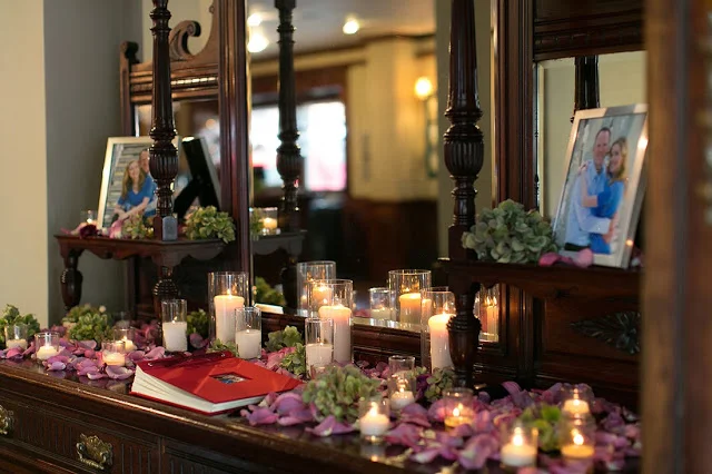 Katie carried a lovely bouquet of all white peonies. When I saw the couple for the sample centerpiece showing, Katie brought with her some family heirlooms from her grandmothers. Here we attached her grandmother’s locket and her other grandmother’s rosary to the handle of the bouquet. I love how it turned out!